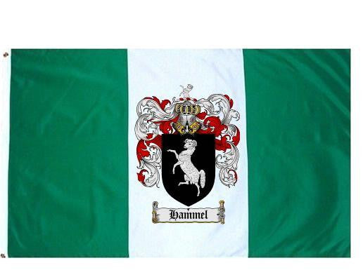 Hammel Family Crest Flag / Coat of Arms Flag. You will receive a high quality 3' x 5' Polyester flag with two brass grommets. Proudly display your family heritage with this flag, or hang as a banner on a wall. Our flags make great gifts for birthdays, weddings, anniversaries, fathers day, mothers day, groomsmen gifts, and any other occasion