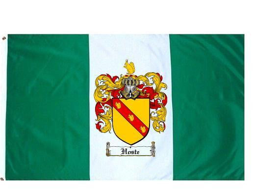 Hoste Family Crest Flag / Coat of Arms Flag. You will receive a high quality 3' x 5' Polyester flag with two brass grommets. Proudly display your family heritage with this flag, or hang as a banner on a wall. Our flags make great gifts for birthdays, weddings, anniversaries, fathers day, mothers day, groomsmen gifts, and any other occasion
