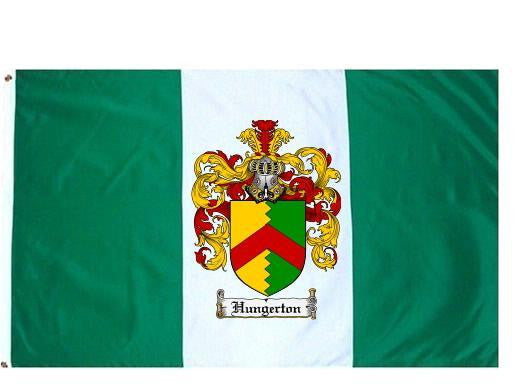 Hungerton Family Crest Flag / Coat of Arms Flag. You will receive a high quality 3' x 5' Polyester flag with two brass grommets. Proudly display your family heritage with this flag, or hang as a banner on a wall. Our flags make great gifts for birthdays, weddings, anniversaries, fathers day, mothers day, groomsmen gifts, and any other occasion
