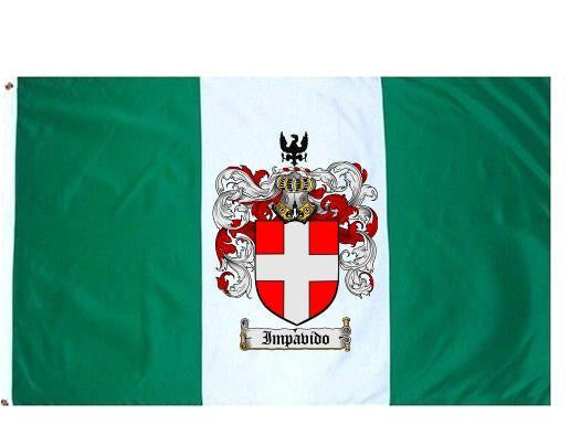 Impavido Family Crest Flag / Coat of Arms Flag. You will receive a high quality 3' x 5' Polyester flag with two brass grommets. Proudly display your family heritage with this flag, or hang as a banner on a wall. Our flags make great gifts for birthdays, weddings, anniversaries, fathers day, mothers day, groomsmen gifts, and any other occasion
