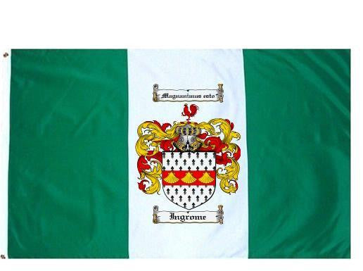 Ingrome Family Crest Flag / Coat of Arms Flag. You will receive a high quality 3' x 5' Polyester flag with two brass grommets. Proudly display your family heritage with this flag, or hang as a banner on a wall. Our flags make great gifts for birthdays, weddings, anniversaries, fathers day, mothers day, groomsmen gifts, and any other occasion