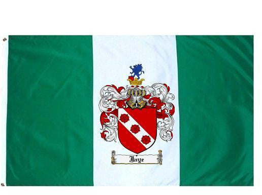 Jaye Family Crest Flag / Coat of Arms Flag. You will receive a high quality 3' x 5' Polyester flag with two brass grommets. Proudly display your family heritage with this flag, or hang as a banner on a wall. Our flags make great gifts for birthdays, weddings, anniversaries, fathers day, mothers day, groomsmen gifts, and any other occasion