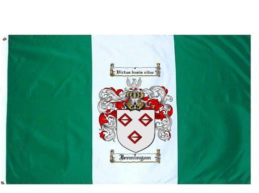 Jenningan Family Crest Flag / Coat of Arms Flag. You will receive a high quality 3' x 5' Polyester flag with two brass grommets. Proudly display your family heritage with this flag, or hang as a banner on a wall. Our flags make great gifts for birthdays, weddings, anniversaries, fathers day, mothers day, groomsmen gifts, and any other occasion