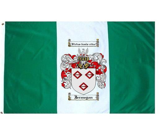 Jermegan Family Crest Flag / Coat of Arms Flag. You will receive a high quality 3' x 5' Polyester flag with two brass grommets. Proudly display your family heritage with this flag, or hang as a banner on a wall. Our flags make great gifts for birthdays, weddings, anniversaries, fathers day, mothers day, groomsmen gifts, and any other occasion