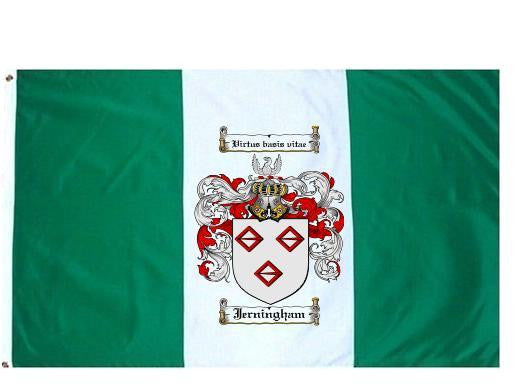 Jerningham Family Crest Flag / Coat of Arms Flag. You will receive a high quality 3' x 5' Polyester flag with two brass grommets. Proudly display your family heritage with this flag, or hang as a banner on a wall. Our flags make great gifts for birthdays, weddings, anniversaries, fathers day, mothers day, groomsmen gifts, and any other occasion