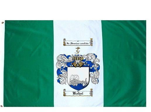 Kahel Family Crest Flag / Coat of Arms Flag. You will receive a high quality 3' x 5' Polyester flag with two brass grommets. Proudly display your family heritage with this flag, or hang as a banner on a wall. Our flags make great gifts for birthdays, weddings, anniversaries, fathers day, mothers day, groomsmen gifts, and any other occasion
