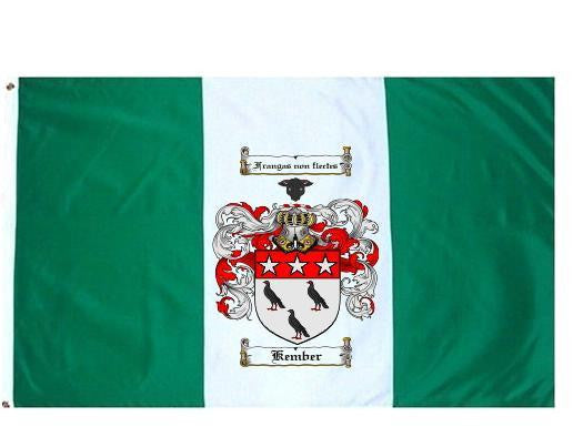 Kember Family Crest Flag / Coat of Arms Flag. You will receive a high quality 3' x 5' Polyester flag with two brass grommets. Proudly display your family heritage with this flag, or hang as a banner on a wall. Our flags make great gifts for birthdays, weddings, anniversaries, fathers day, mothers day, groomsmen gifts, and any other occasion