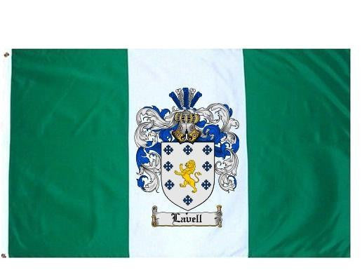 Lavell Family Crest Flag / Coat of Arms Flag. You will receive a high quality 3' x 5' Polyester flag with two brass grommets. Proudly display your family heritage with this flag, or hang as a banner on a wall. Our flags make great gifts for birthdays, weddings, anniversaries, fathers day, mothers day, groomsmen gifts, and any other occasion