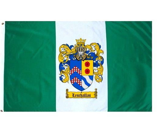 Leschallas Family Crest Flag / Coat of Arms Flag. You will receive a high quality 3' x 5' Polyester flag with two brass grommets. Proudly display your family heritage with this flag, or hang as a banner on a wall. Our flags make great gifts for birthdays, weddings, anniversaries, fathers day, mothers day, groomsmen gifts, and any other occasion