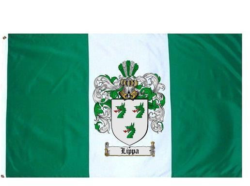 Lippa Family Crest Flag / Coat of Arms Flag. You will receive a high quality 3' x 5' Polyester flag with two brass grommets. Proudly display your family heritage with this flag, or hang as a banner on a wall. Our flags make great gifts for birthdays, weddings, anniversaries, fathers day, mothers day, groomsmen gifts, and any other occasion