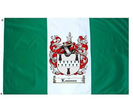 Lunnen Family Crest Flag / Coat of Arms Flag. You will receive a high quality 3' x 5' Polyester flag with two brass grommets. Proudly display your family heritage with this flag, or hang as a banner on a wall. Our flags make great gifts for birthdays, weddings, anniversaries, fathers day, mothers day, groomsmen gifts, and any other occasion