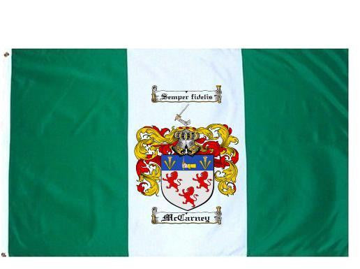 Mccarney Family Crest Flag / Coat of Arms Flag. You will receive a high quality 3' x 5' Polyester flag with two brass grommets. Proudly display your family heritage with this flag, or hang as a banner on a wall. Our flags make great gifts for birthdays, weddings, anniversaries, fathers day, mothers day, groomsmen gifts, and any other occasion
