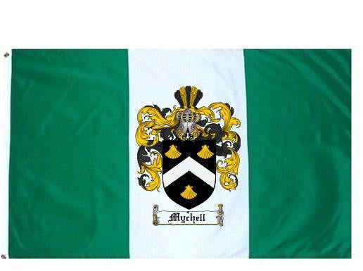 Mychell Family Crest Flag / Coat of Arms Flag. You will receive a high quality 3' x 5' Polyester flag with two brass grommets. Proudly display your family heritage with this flag, or hang as a banner on a wall. Our flags make great gifts for birthdays, weddings, anniversaries, fathers day, mothers day, groomsmen gifts, and any other occasion