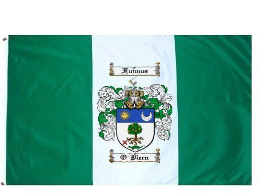 O'Biern Family Crest Flag / Coat of Arms Flag. You will receive a high quality 3' x 5' Polyester flag with two brass grommets. Proudly display your family heritage with this flag, or hang as a banner on a wall. Our flags make great gifts for birthdays, weddings, anniversaries, fathers day, mothers day, groomsmen gifts, and any other occasion