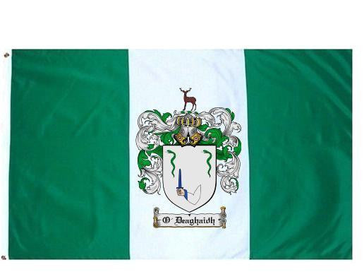 O'Deaghaidh Family Crest Flag / Coat of Arms Flag. You will receive a high quality 3' x 5' Polyester flag with two brass grommets. Proudly display your family heritage with this flag, or hang as a banner on a wall. Our flags make great gifts for birthdays, weddings, anniversaries, fathers day, mothers day, groomsmen gifts, and any other occasion