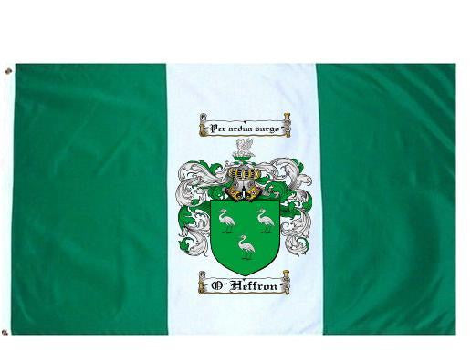 O'Heffron Family Crest Flag / Coat of Arms Flag. You will receive a high quality 3' x 5' Polyester flag with two brass grommets. Proudly display your family heritage with this flag, or hang as a banner on a wall. Our flags make great gifts for birthdays, weddings, anniversaries, fathers day, mothers day, groomsmen gifts, and any other occasion