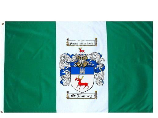 O'Lunney Family Crest Flag / Coat of Arms Flag. You will receive a high quality 3' x 5' Polyester flag with two brass grommets. Proudly display your family heritage with this flag, or hang as a banner on a wall. Our flags make great gifts for birthdays, weddings, anniversaries, fathers day, mothers day, groomsmen gifts, and any other occasion