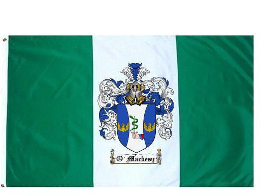 O'Mackesy Family Crest Flag / Coat of Arms Flag. You will receive a high quality 3' x 5' Polyester flag with two brass grommets. Proudly display your family heritage with this flag, or hang as a banner on a wall. Our flags make great gifts for birthdays, weddings, anniversaries, fathers day, mothers day, groomsmen gifts, and any other occasion