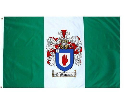 O'Mulroney Family Crest Flag / Coat of Arms Flag. You will receive a high quality 3' x 5' Polyester flag with two brass grommets. Proudly display your family heritage with this flag, or hang as a banner on a wall. Our flags make great gifts for birthdays, weddings, anniversaries, fathers day, mothers day, groomsmen gifts, and any other occasion