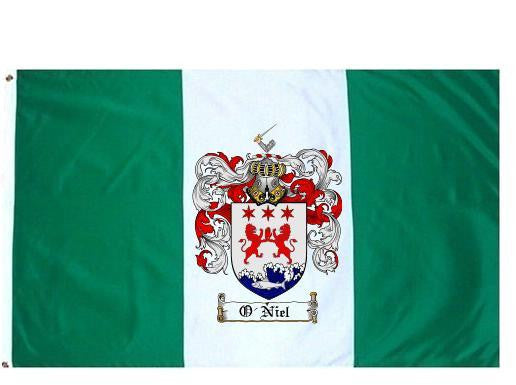 O'Niel Family Crest Flag / Coat of Arms Flag. You will receive a high quality 3' x 5' Polyester flag with two brass grommets. Proudly display your family heritage with this flag, or hang as a banner on a wall. Our flags make great gifts for birthdays, weddings, anniversaries, fathers day, mothers day, groomsmen gifts, and any other occasion