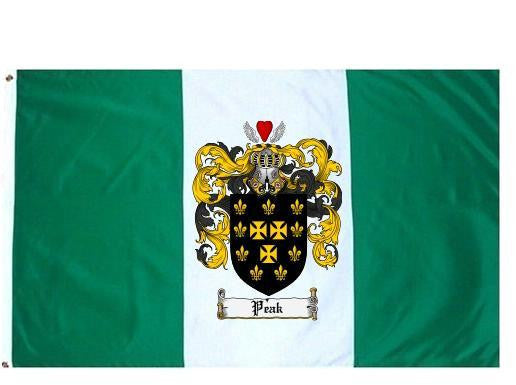 Peak Family Crest Flag / Coat of Arms Flag. You will receive a high quality 3' x 5' Polyester flag with two brass grommets. Proudly display your family heritage with this flag, or hang as a banner on a wall. Our flags make great gifts for birthdays, weddings, anniversaries, fathers day, mothers day, groomsmen gifts, and any other occasion