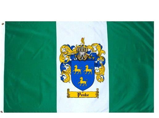 Peake Family Crest Flag / Coat of Arms Flag. You will receive a high quality 3' x 5' Polyester flag with two brass grommets. Proudly display your family heritage with this flag, or hang as a banner on a wall. Our flags make great gifts for birthdays, weddings, anniversaries, fathers day, mothers day, groomsmen gifts, and any other occasion