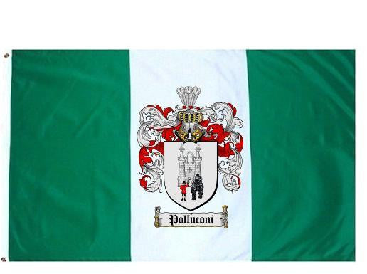 Polluconi Family Crest Flag / Coat of Arms Flag. You will receive a high quality 3' x 5' Polyester flag with two brass grommets. Proudly display your family heritage with this flag, or hang as a banner on a wall. Our flags make great gifts for birthdays, weddings, anniversaries, fathers day, mothers day, groomsmen gifts, and any other occasion