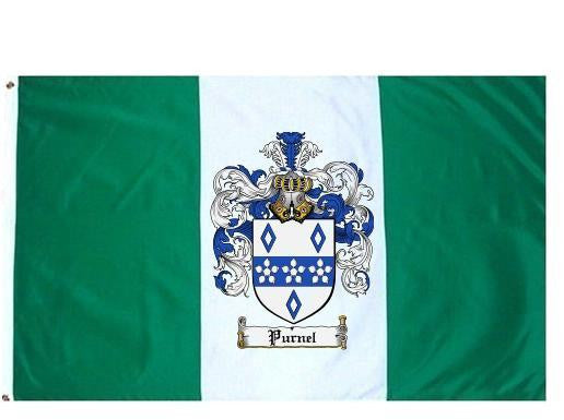 Purnel Family Crest Flag / Coat of Arms Flag. You will receive a high quality 3' x 5' Polyester flag with two brass grommets. Proudly display your family heritage with this flag, or hang as a banner on a wall. Our flags make great gifts for birthdays, weddings, anniversaries, fathers day, mothers day, groomsmen gifts, and any other occasion