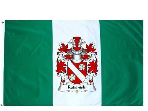 Radoniski Family Crest Flag / Coat of Arms Flag. You will receive a high quality 3' x 5' Polyester flag with two brass grommets. Proudly display your family heritage with this flag, or hang as a banner on a wall. Our flags make great gifts for birthdays, weddings, anniversaries, fathers day, mothers day, groomsmen gifts, and any other occasion
