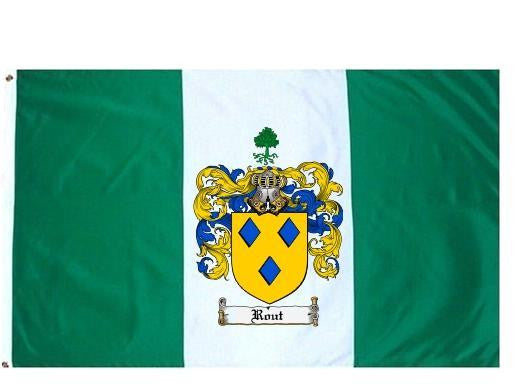 Rout Family Crest Flag / Coat of Arms Flag. You will receive a high quality 3' x 5' Polyester flag with two brass grommets. Proudly display your family heritage with this flag, or hang as a banner on a wall. Our flags make great gifts for birthdays, weddings, anniversaries, fathers day, mothers day, groomsmen gifts, and any other occasion