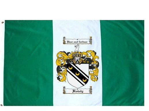 Rowly Family Crest Flag / Coat of Arms Flag. You will receive a high quality 3' x 5' Polyester flag with two brass grommets. Proudly display your family heritage with this flag, or hang as a banner on a wall. Our flags make great gifts for birthdays, weddings, anniversaries, fathers day, mothers day, groomsmen gifts, and any other occasion
