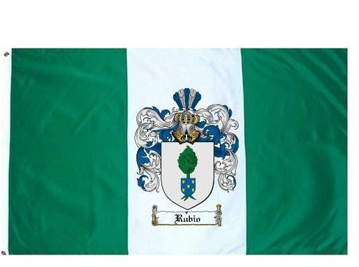 Rubio Family Crest Flag / Coat of Arms Flag. You will receive a high quality 3' x 5' Polyester flag with two brass grommets. Proudly display your family heritage with this flag, or hang as a banner on a wall. Our flags make great gifts for birthdays, weddings, anniversaries, fathers day, mothers day, groomsmen gifts, and any other occasion