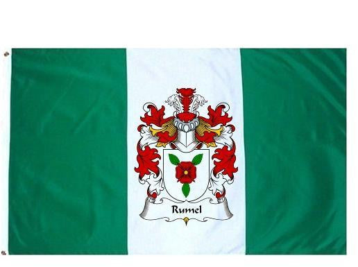 Rumel Family Crest Flag / Coat of Arms Flag. You will receive a high quality 3' x 5' Polyester flag with two brass grommets. Proudly display your family heritage with this flag, or hang as a banner on a wall. Our flags make great gifts for birthdays, weddings, anniversaries, fathers day, mothers day, groomsmen gifts, and any other occasion