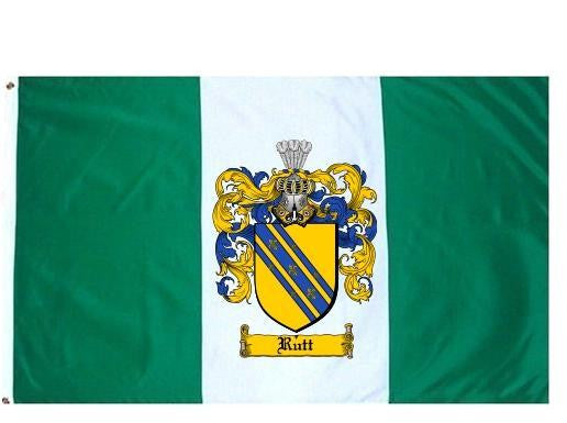 Rutt Family Crest Flag / Coat of Arms Flag. You will receive a high quality 3' x 5' Polyester flag with two brass grommets. Proudly display your family heritage with this flag, or hang as a banner on a wall. Our flags make great gifts for birthdays, weddings, anniversaries, fathers day, mothers day, groomsmen gifts, and any other occasion