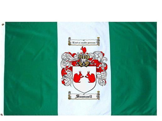 Samuell Family Crest Flag / Coat of Arms Flag. You will receive a high quality 3' x 5' Polyester flag with two brass grommets. Proudly display your family heritage with this flag, or hang as a banner on a wall. Our flags make great gifts for birthdays, weddings, anniversaries, fathers day, mothers day, groomsmen gifts, and any other occasion