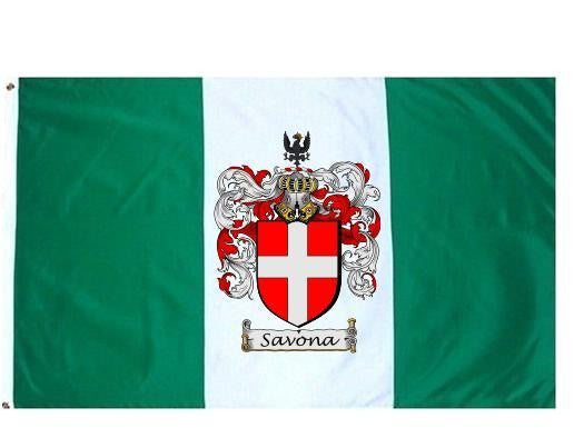 Savona Family Crest Flag / Coat of Arms Flag. You will receive a high quality 3' x 5' Polyester flag with two brass grommets. Proudly display your family heritage with this flag, or hang as a banner on a wall. Our flags make great gifts for birthdays, weddings, anniversaries, fathers day, mothers day, groomsmen gifts, and any other occasion