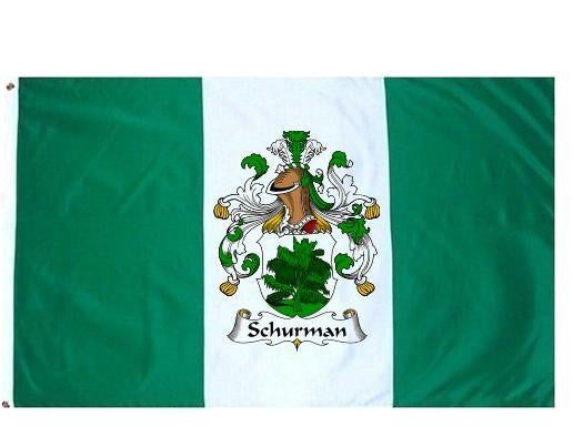 Schurman Family Crest Flag / Coat of Arms Flag. You will receive a high quality 3' x 5' Polyester flag with two brass grommets. Proudly display your family heritage with this flag, or hang as a banner on a wall. Our flags make great gifts for birthdays, weddings, anniversaries, fathers day, mothers day, groomsmen gifts, and any other occasion