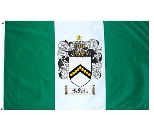 Sefferin Family Crest Flag / Coat of Arms Flag. You will receive a high quality 3' x 5' Polyester flag with two brass grommets. Proudly display your family heritage with this flag, or hang as a banner on a wall. Our flags make great gifts for birthdays, weddings, anniversaries, fathers day, mothers day, groomsmen gifts, and any other occasion