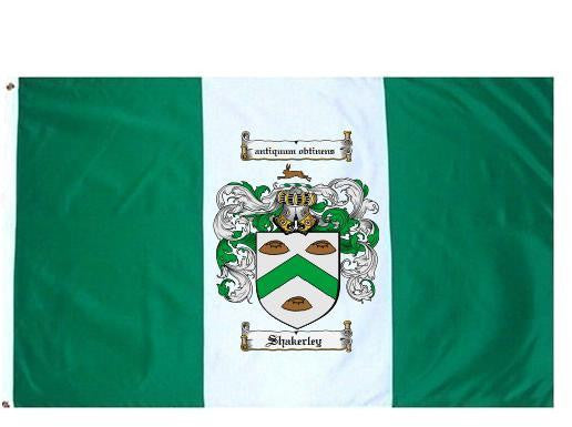 Shakerley Family Crest Flag / Coat of Arms Flag. You will receive a high quality 3' x 5' Polyester flag with two brass grommets. Proudly display your family heritage with this flag, or hang as a banner on a wall. Our flags make great gifts for birthdays, weddings, anniversaries, fathers day, mothers day, groomsmen gifts, and any other occasion