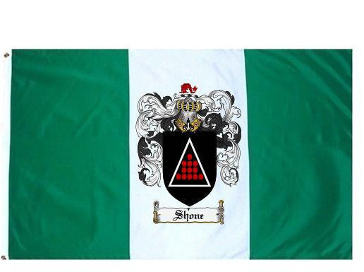 Shone Family Crest Flag / Coat of Arms Flag. You will receive a high quality 3' x 5' Polyester flag with two brass grommets. Proudly display your family heritage with this flag, or hang as a banner on a wall. Our flags make great gifts for birthdays, weddings, anniversaries, fathers day, mothers day, groomsmen gifts, and any other occasion