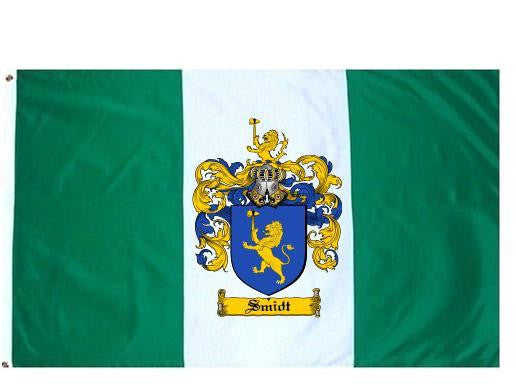 Smidt Family Crest Flag / Coat of Arms Flag. You will receive a high quality 3' x 5' Polyester flag with two brass grommets. Proudly display your family heritage with this flag, or hang as a banner on a wall. Our flags make great gifts for birthdays, weddings, anniversaries, fathers day, mothers day, groomsmen gifts, and any other occasion