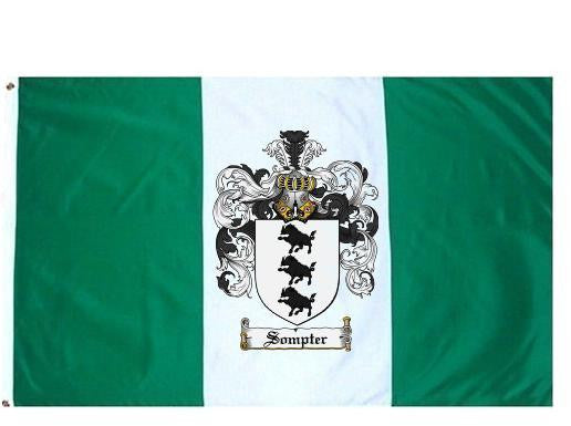 Sompter Family Crest Flag / Coat of Arms Flag. You will receive a high quality 3' x 5' Polyester flag with two brass grommets. Proudly display your family heritage with this flag, or hang as a banner on a wall. Our flags make great gifts for birthdays, weddings, anniversaries, fathers day, mothers day, groomsmen gifts, and any other occasion