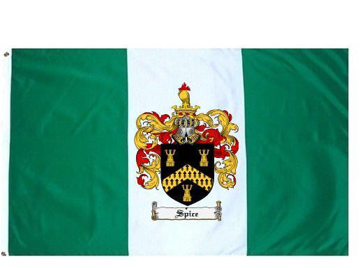 Spice Family Crest Flag / Coat of Arms Flag. You will receive a high quality 3' x 5' Polyester flag with two brass grommets. Proudly display your family heritage with this flag, or hang as a banner on a wall. Our flags make great gifts for birthdays, weddings, anniversaries, fathers day, mothers day, groomsmen gifts, and any other occasion