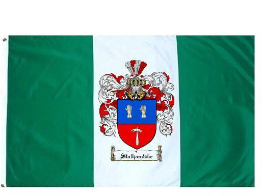 Stalhandske Family Crest Flag / Coat of Arms Flag. You will receive a high quality 3' x 5' Polyester flag with two brass grommets. Proudly display your family heritage with this flag, or hang as a banner on a wall. Our flags make great gifts for birthdays, weddings, anniversaries, fathers day, mothers day, groomsmen gifts, and any other occasion