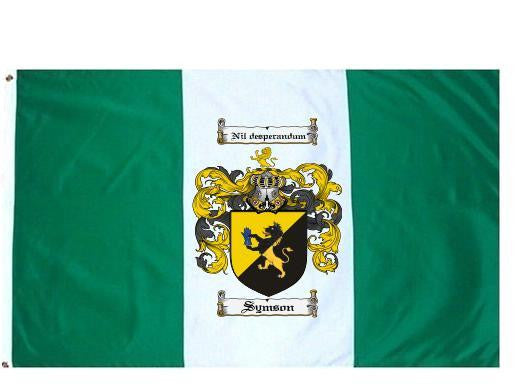 Symson Family Crest Flag / Coat of Arms Flag. You will receive a high quality 3' x 5' Polyester flag with two brass grommets. Proudly display your family heritage with this flag, or hang as a banner on a wall. Our flags make great gifts for birthdays, weddings, anniversaries, fathers day, mothers day, groomsmen gifts, and any other occasion