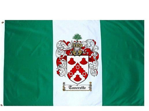 Tancrette Family Crest Flag / Coat of Arms Flag. You will receive a high quality 3' x 5' Polyester flag with two brass grommets. Proudly display your family heritage with this flag, or hang as a banner on a wall. Our flags make great gifts for birthdays, weddings, anniversaries, fathers day, mothers day, groomsmen gifts, and any other occasion
