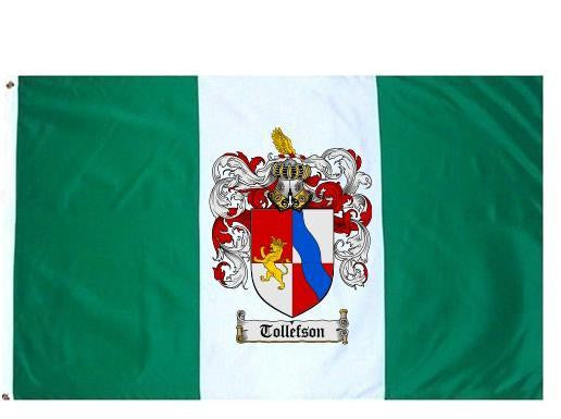 Tollefson Family Crest Flag / Coat of Arms Flag. You will receive a high quality 3' x 5' Polyester flag with two brass grommets. Proudly display your family heritage with this flag, or hang as a banner on a wall. Our flags make great gifts for birthdays, weddings, anniversaries, fathers day, mothers day, groomsmen gifts, and any other occasion