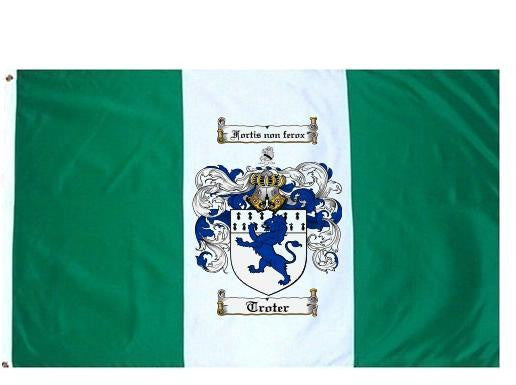 Troter Family Crest Flag / Coat of Arms Flag. You will receive a high quality 3' x 5' Polyester flag with two brass grommets. Proudly display your family heritage with this flag, or hang as a banner on a wall. Our flags make great gifts for birthdays, weddings, anniversaries, fathers day, mothers day, groomsmen gifts, and any other occasion