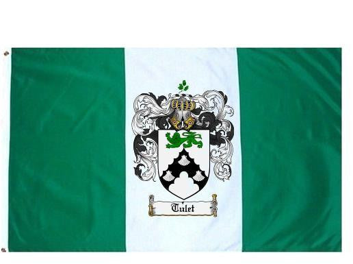 Tulet Family Crest Flag / Coat of Arms Flag. You will receive a high quality 3' x 5' Polyester flag with two brass grommets. Proudly display your family heritage with this flag, or hang as a banner on a wall. Our flags make great gifts for birthdays, weddings, anniversaries, fathers day, mothers day, groomsmen gifts, and any other occasion
