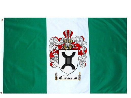 Turnerus Family Crest Flag / Coat of Arms Flag. You will receive a high quality 3' x 5' Polyester flag with two brass grommets. Proudly display your family heritage with this flag, or hang as a banner on a wall. Our flags make great gifts for birthdays, weddings, anniversaries, fathers day, mothers day, groomsmen gifts, and any other occasion